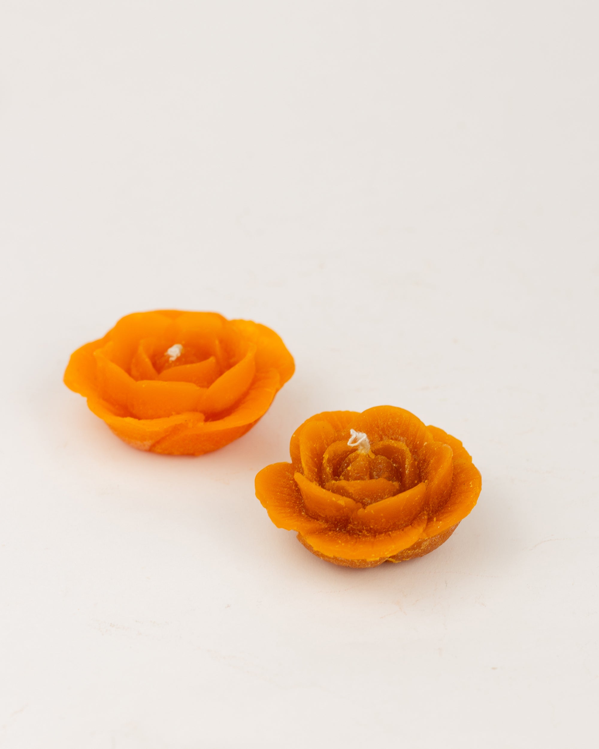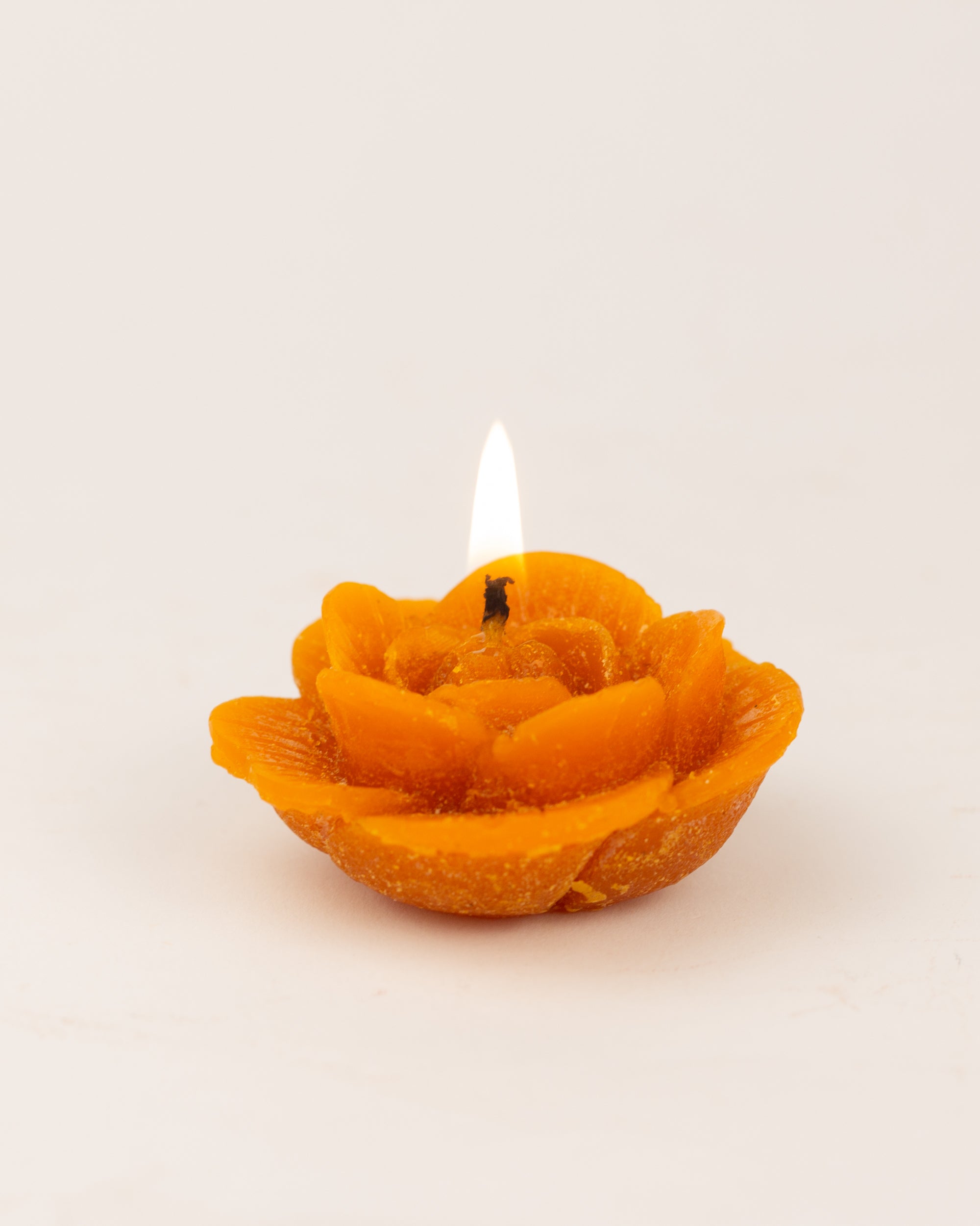 A small flower-shaped candle made from natural beeswax. Its soft orange tone brings a warm, inviting glow to any setting.