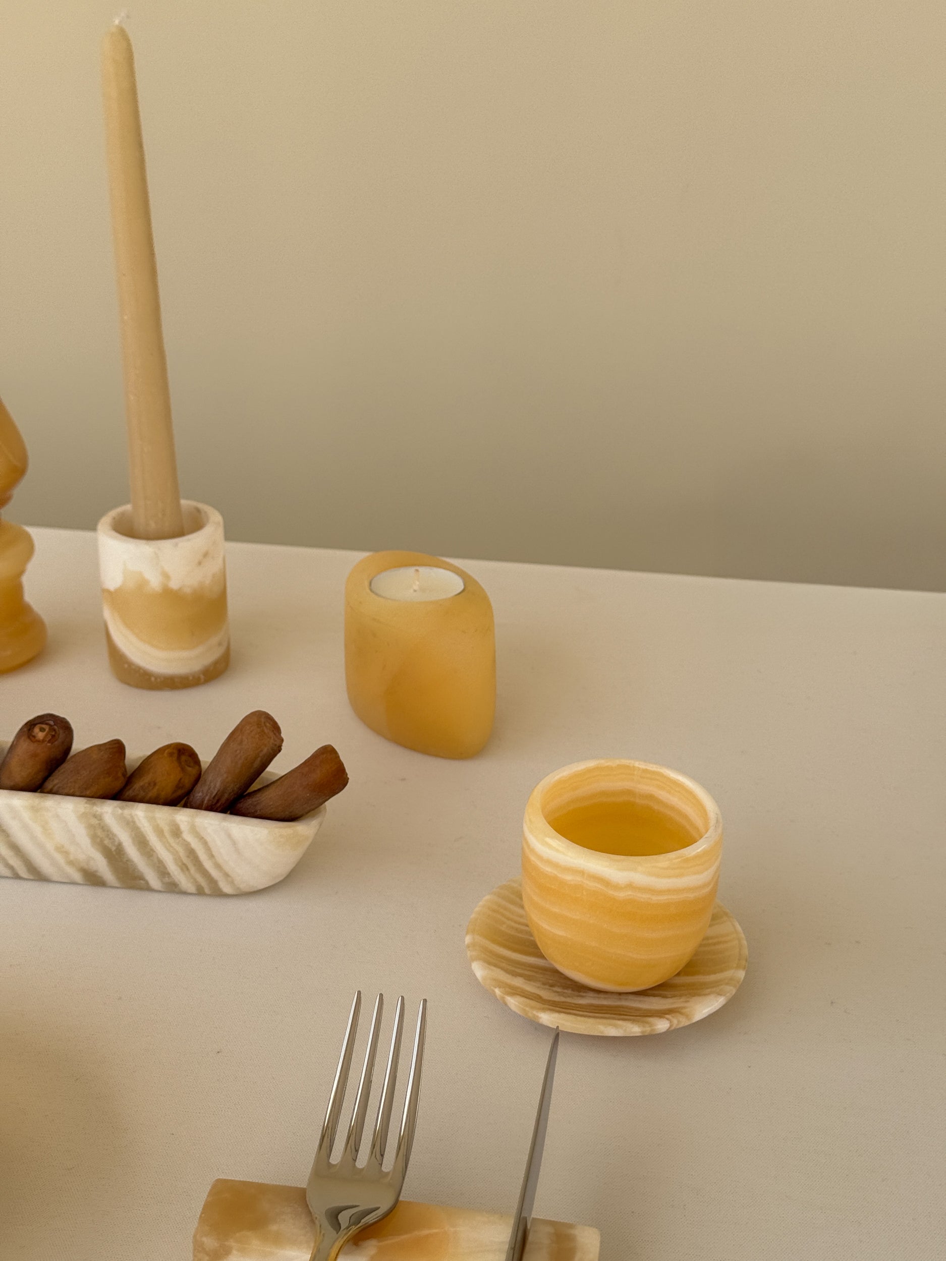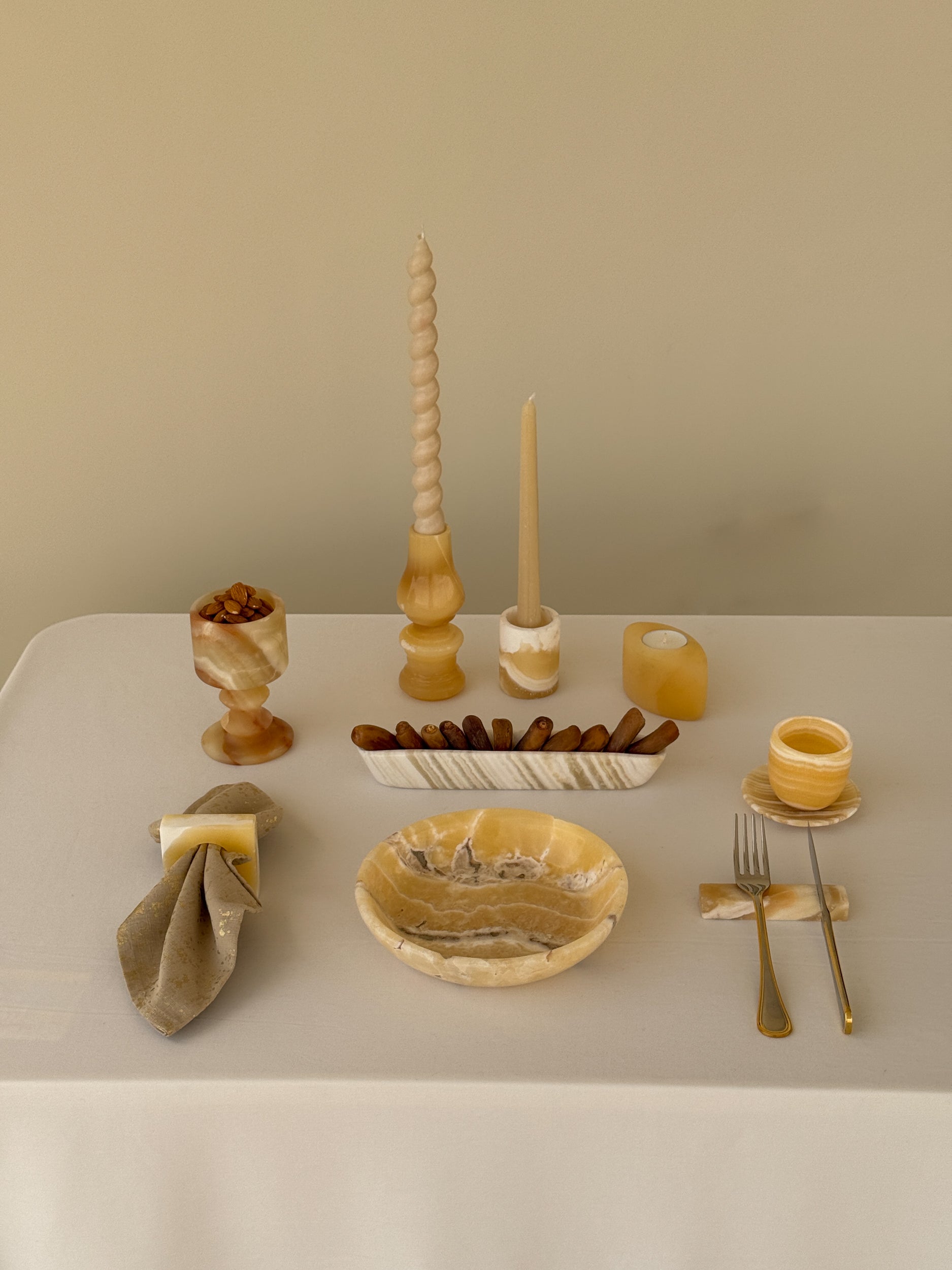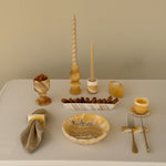Crafted from natural Egyptian alabaster, each piece features unique variations in tone and veining.