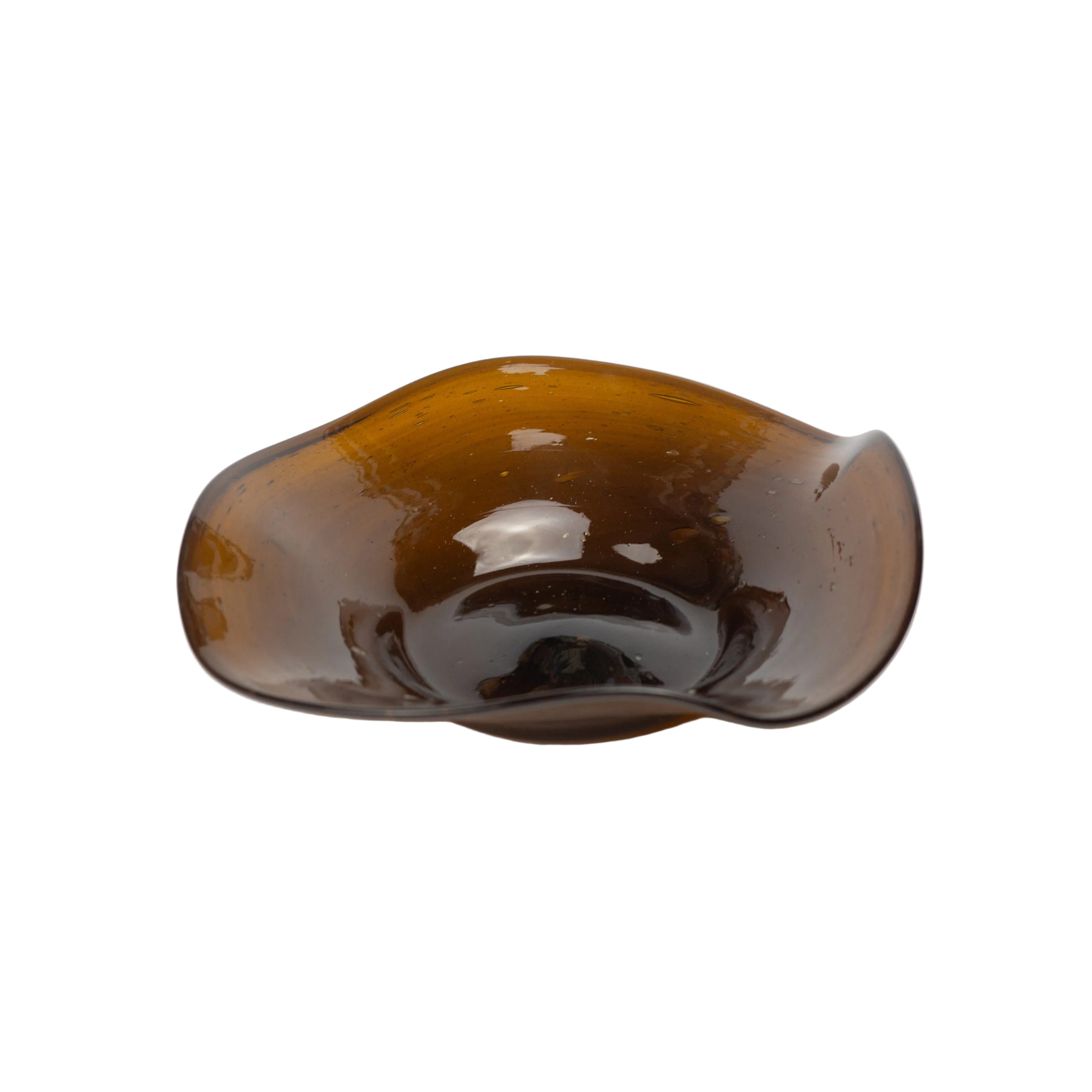 Handcrafted and mouth-blown from recycled glass, this shallow plate features sculptural wavy edges and a swirling design that catches the light beautifully. Its organic, fluid form makes it both a functional table piece and a statement of artisanal craftsmanship.