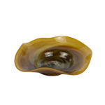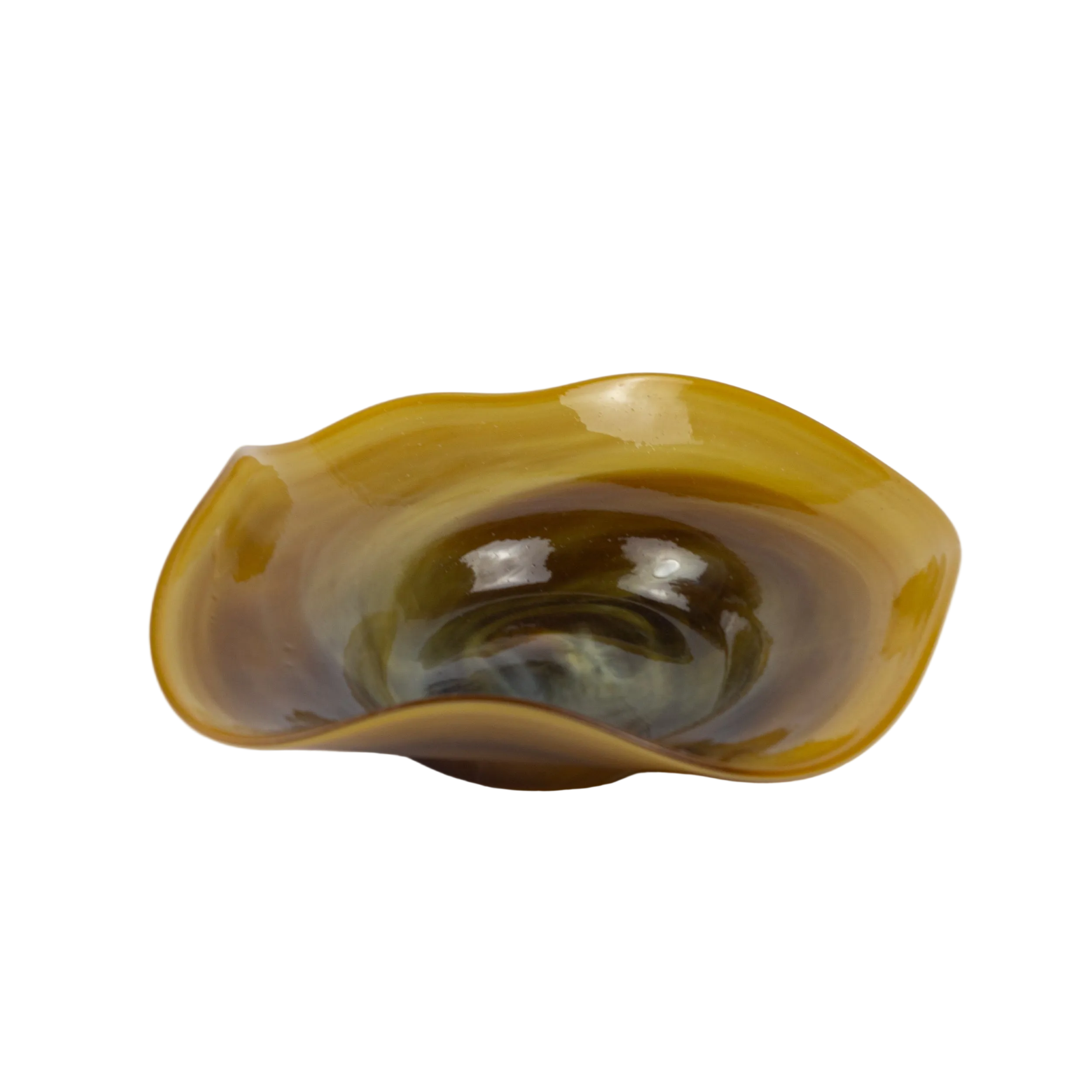 Handcrafted and mouth-blown from recycled glass, this shallow plate features sculptural wavy edges and a swirling design that catches the light beautifully. Its organic, fluid form makes it both a functional table piece and a statement of artisanal craftsmanship.