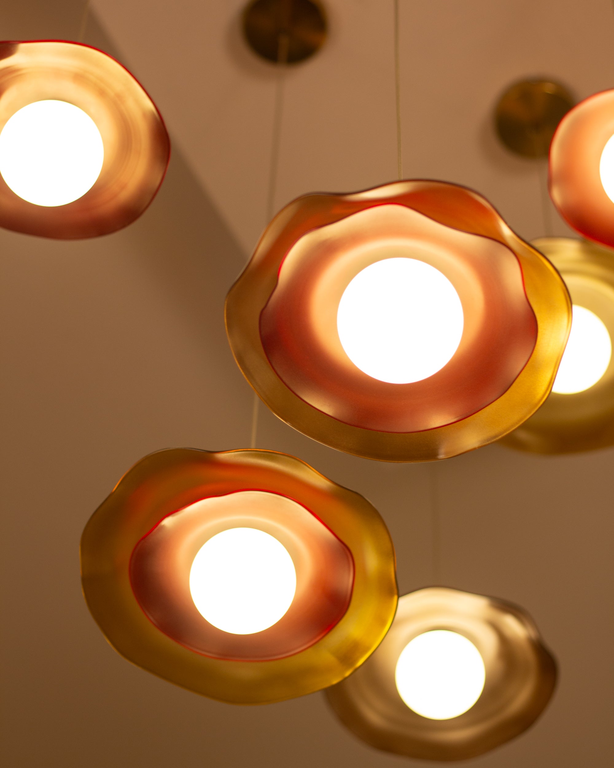 Karkadeh is inspired by the beloved hibiscus drink of Cairo’s qahwas, a symbol of joy and tradition. Its design captures the whirlpool formed when a spoon stirs the glass — a fleeting moment of waves and motion, frozen in rounded glass and illuminated from within.