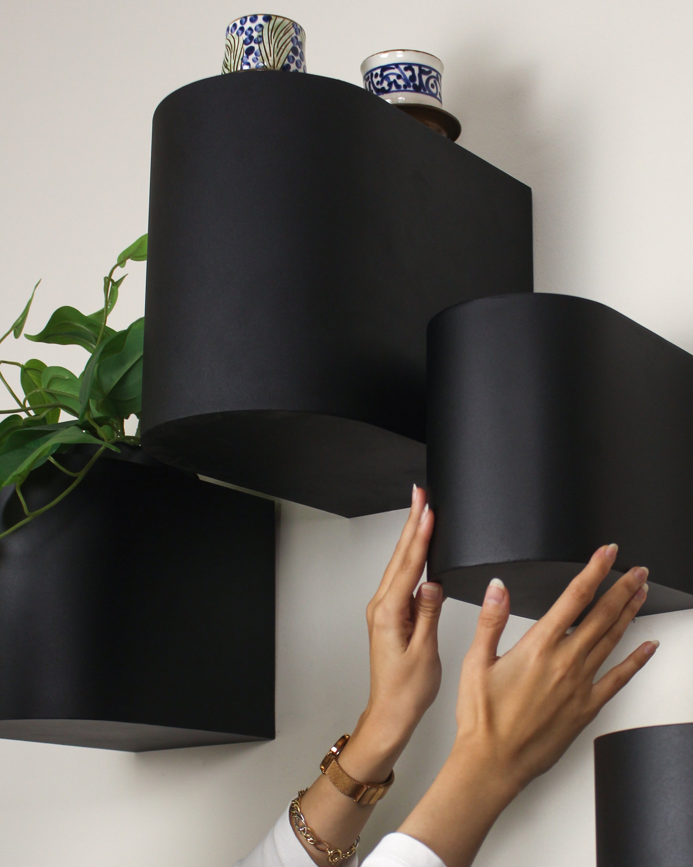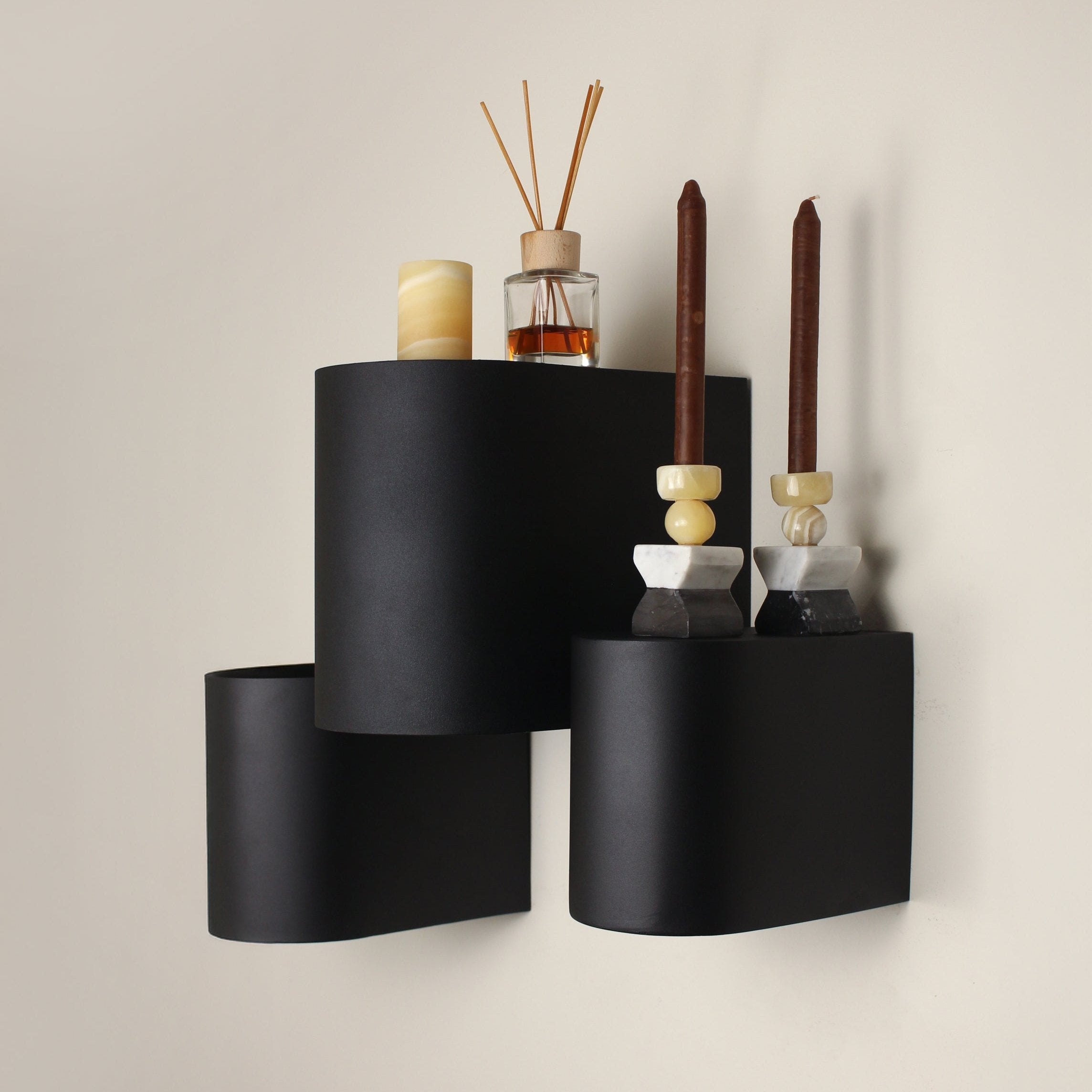 Inspired by the stunning tiers of muqarnas in Islamic Cairo’s architecture, the Muqarnas steel wall shelf set features three different size pieces that can be arranged in multiple ways, bringing layered elegance and timeless design to your walls.