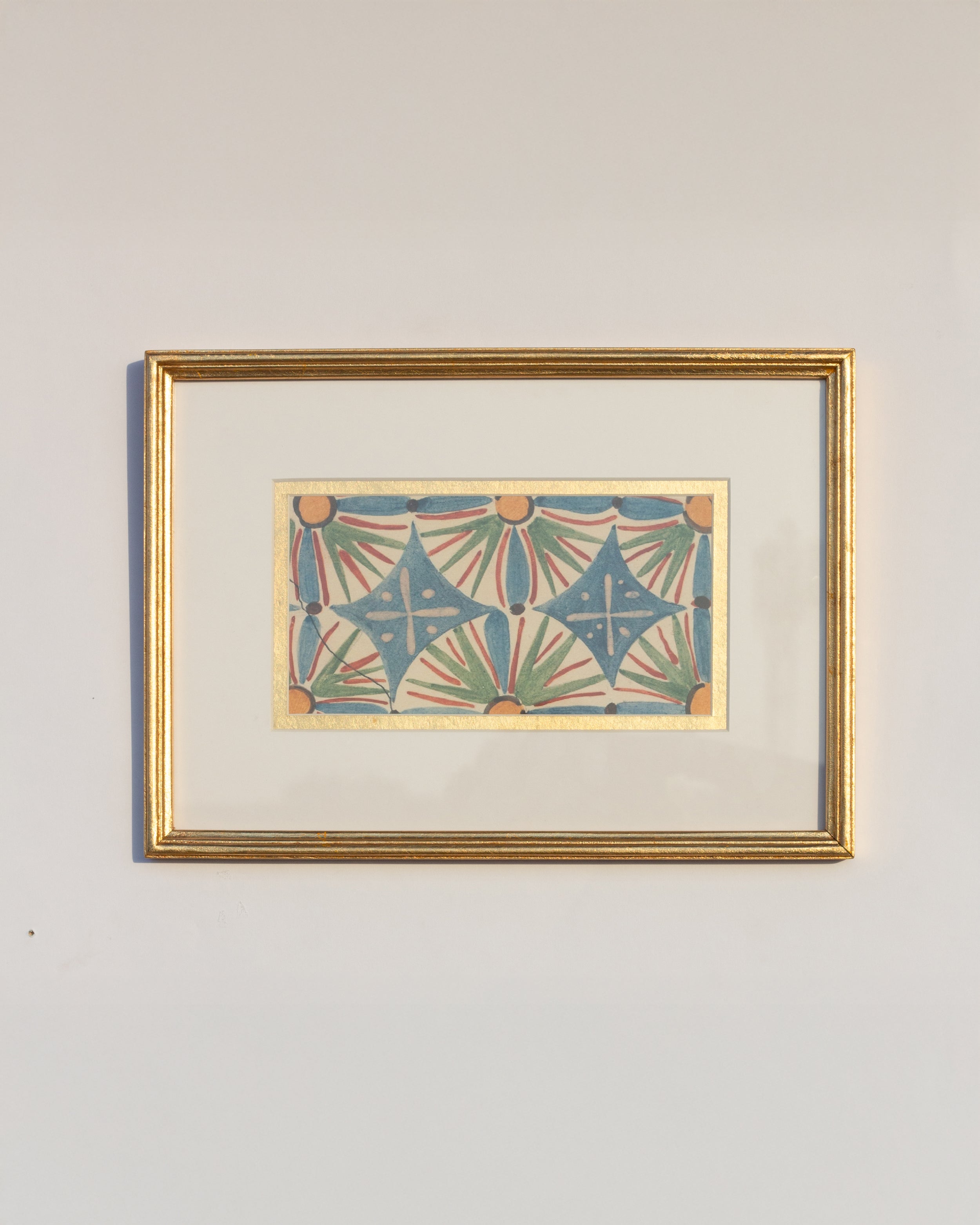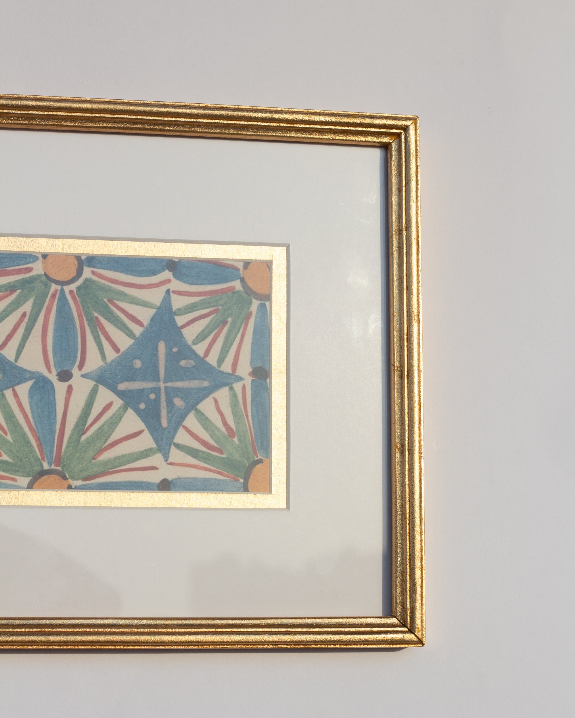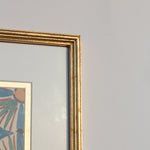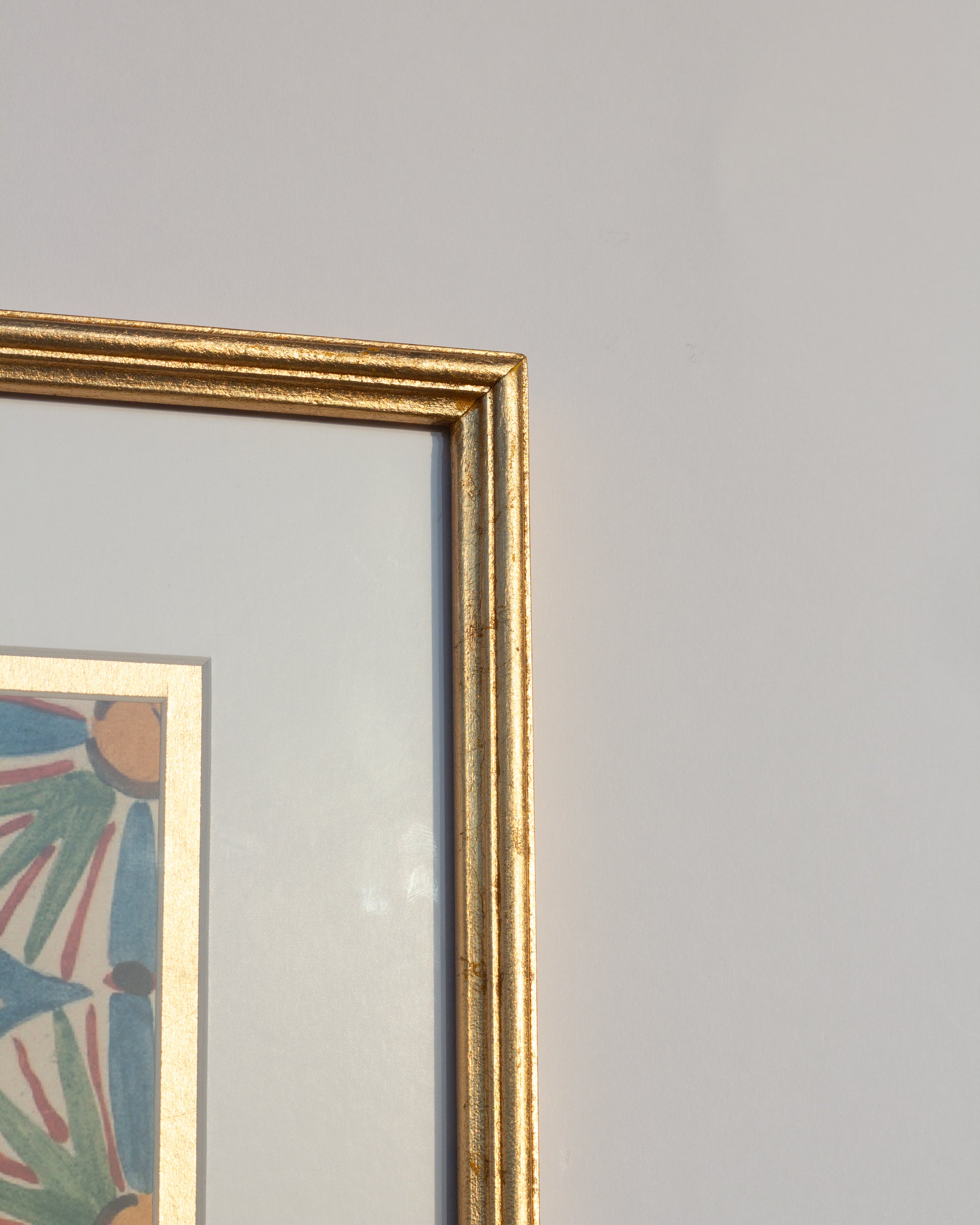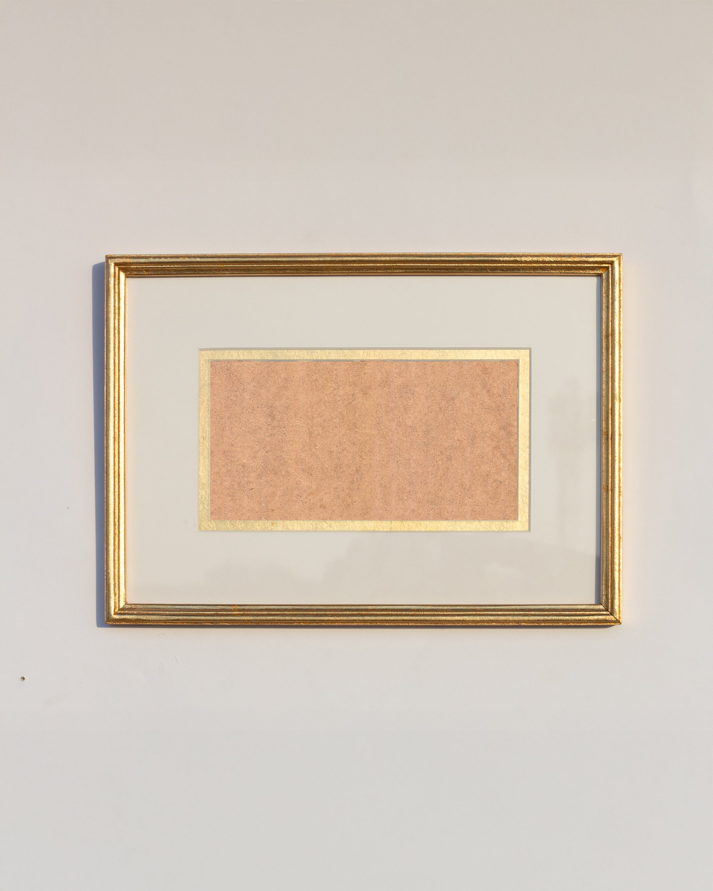 A chic, elegant frame with a double paper mount: a thick white mount accented by a fine gold line, all within a golden wooden frame. Minimal yet sophisticated, it subtly highlights artwork while adding a refined touch to any wall.