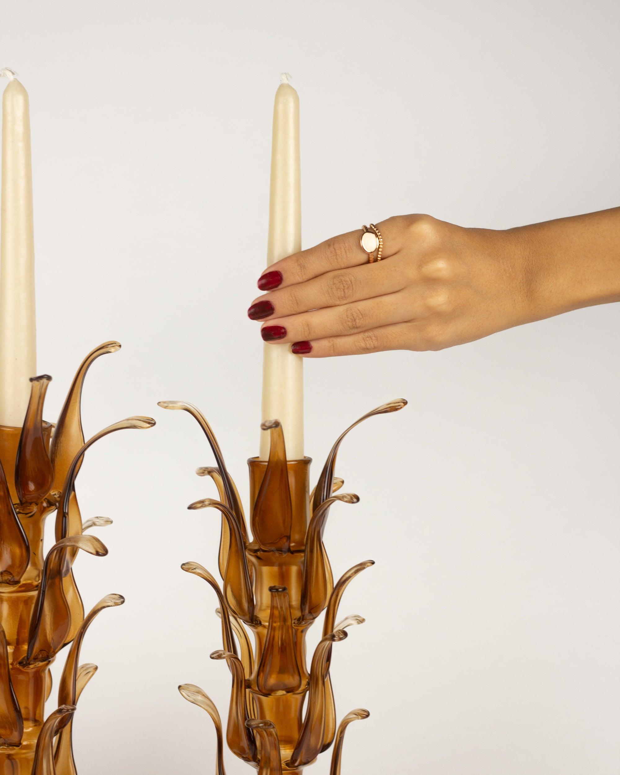 Make a statement with this larger version of our Nakhla Candle Holder. Its layered glass design celebrates the graceful palm trees along the Nile and Corniche, adding natural elegance and ambient light to your space.