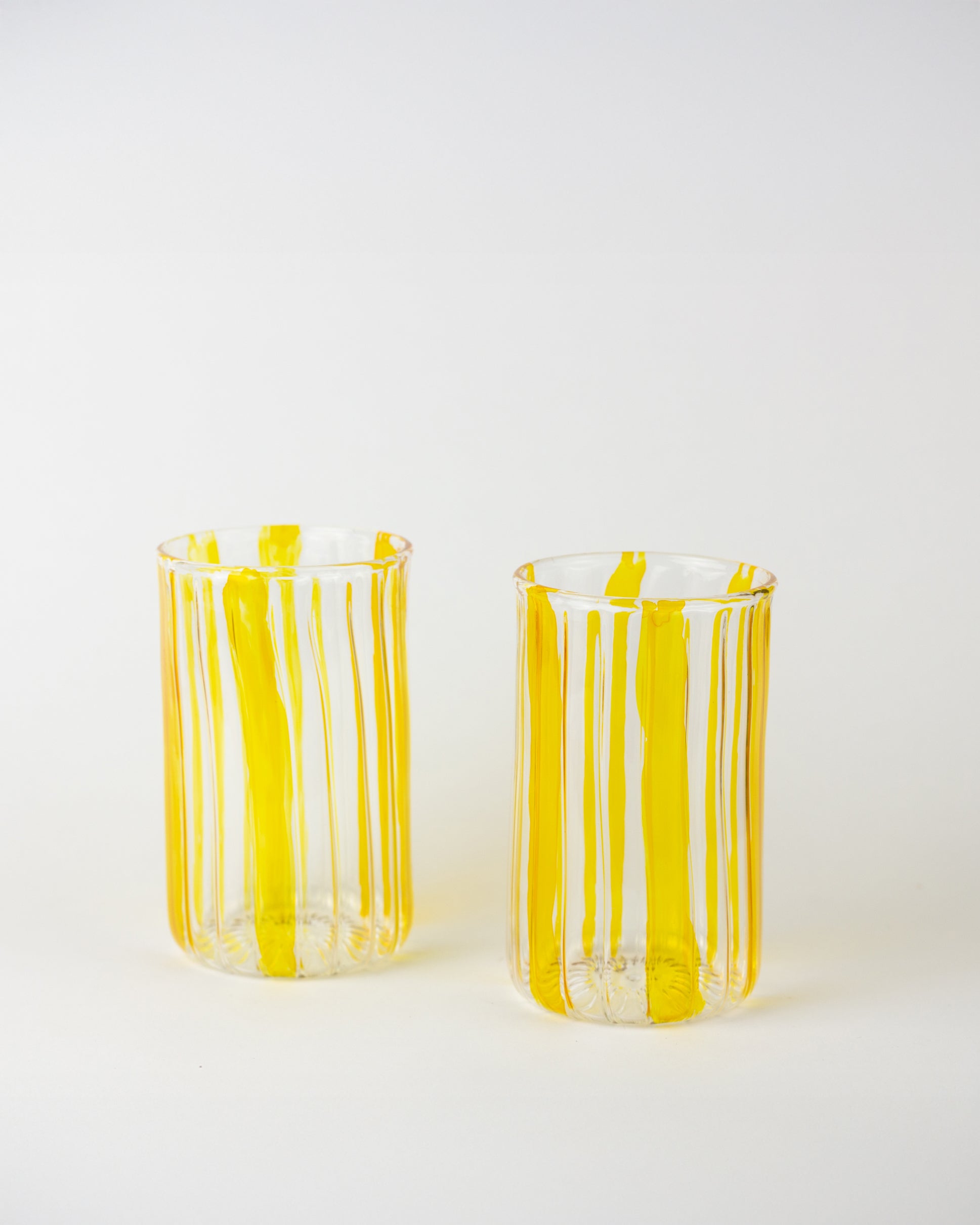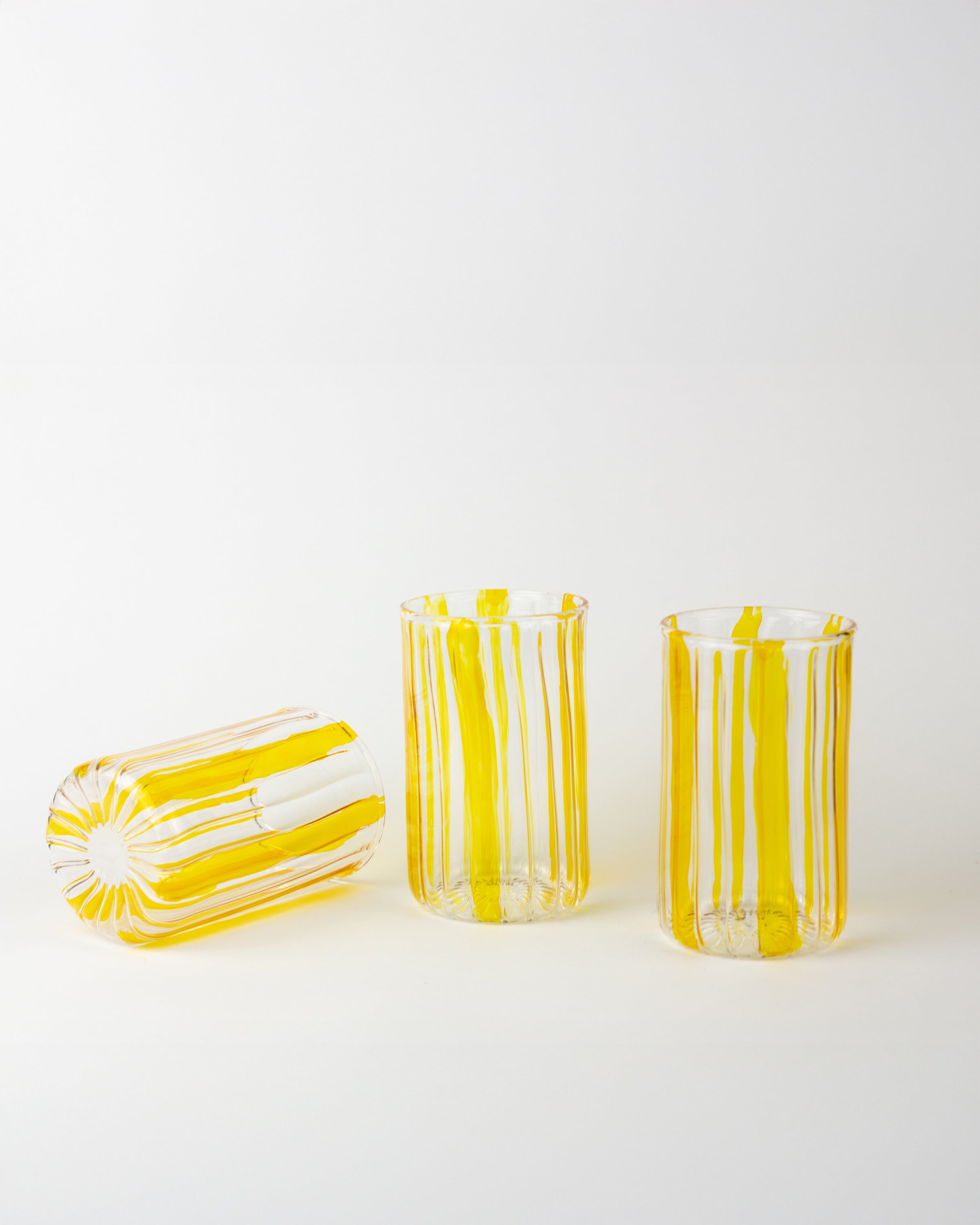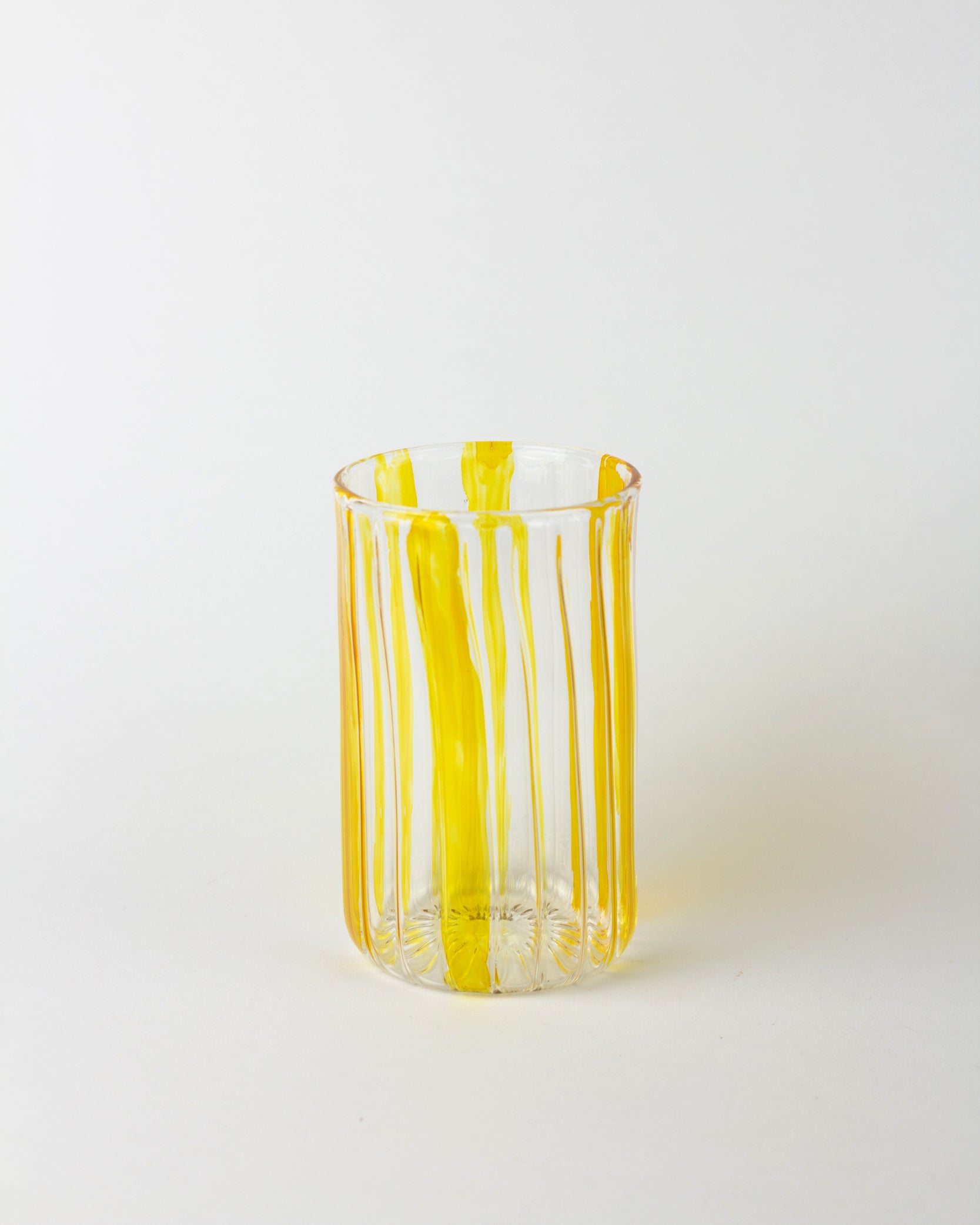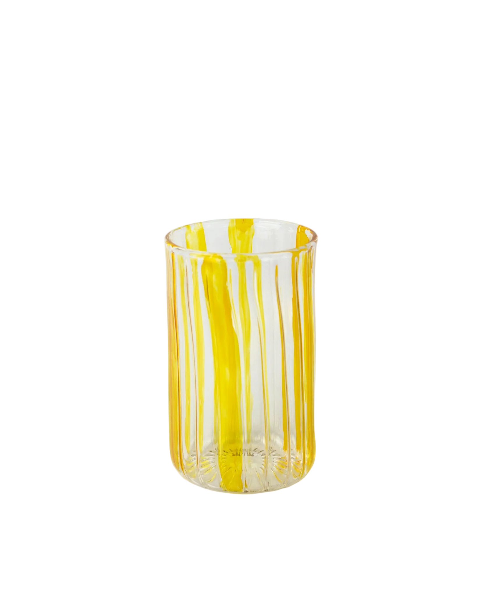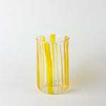 Handmade with care, this Pyrex glass cup features vibrant yellow stripes that add a cheerful touch to every sip. Its handcrafted design ensures each cup is unique, blending everyday practicality with artisanal charm.