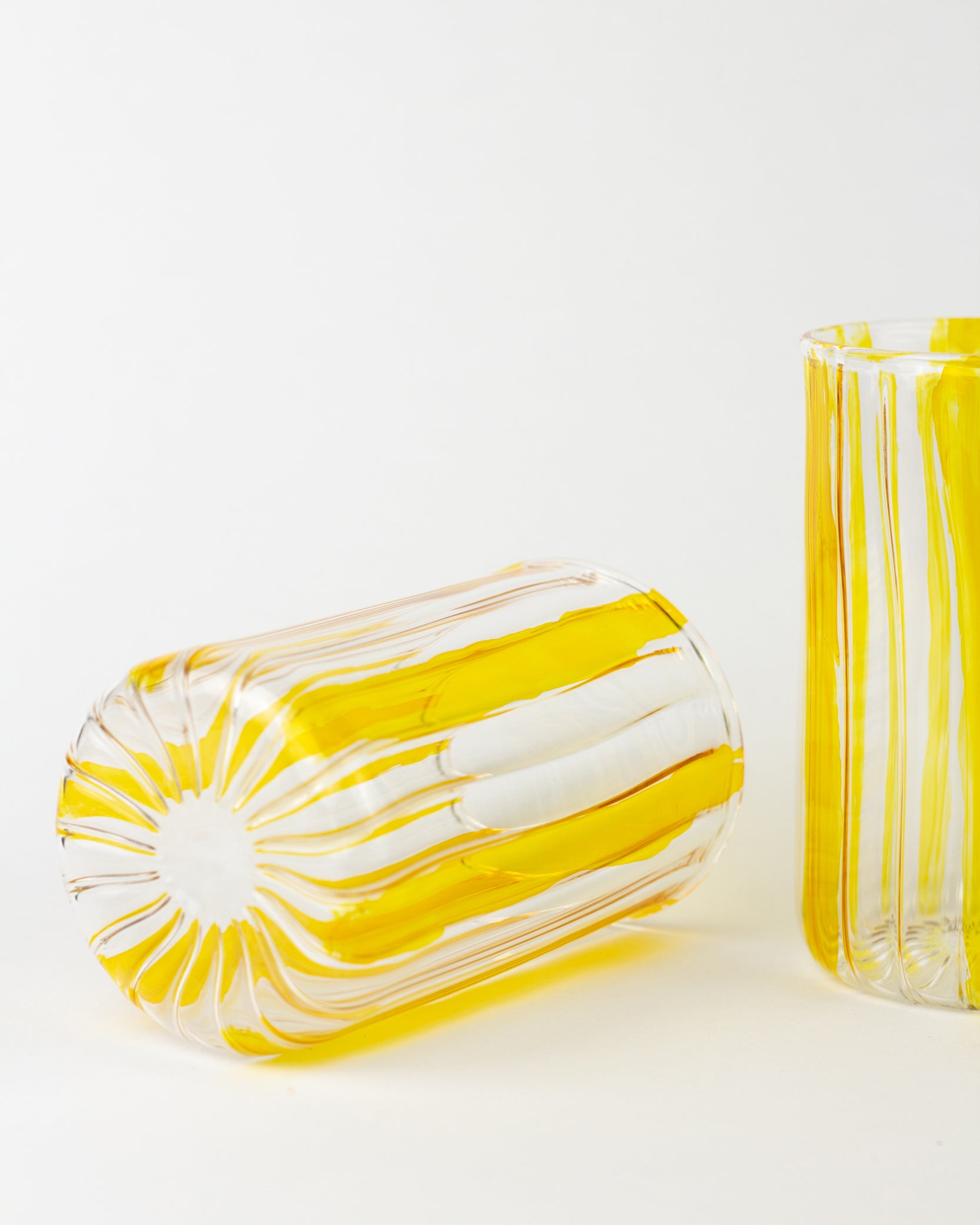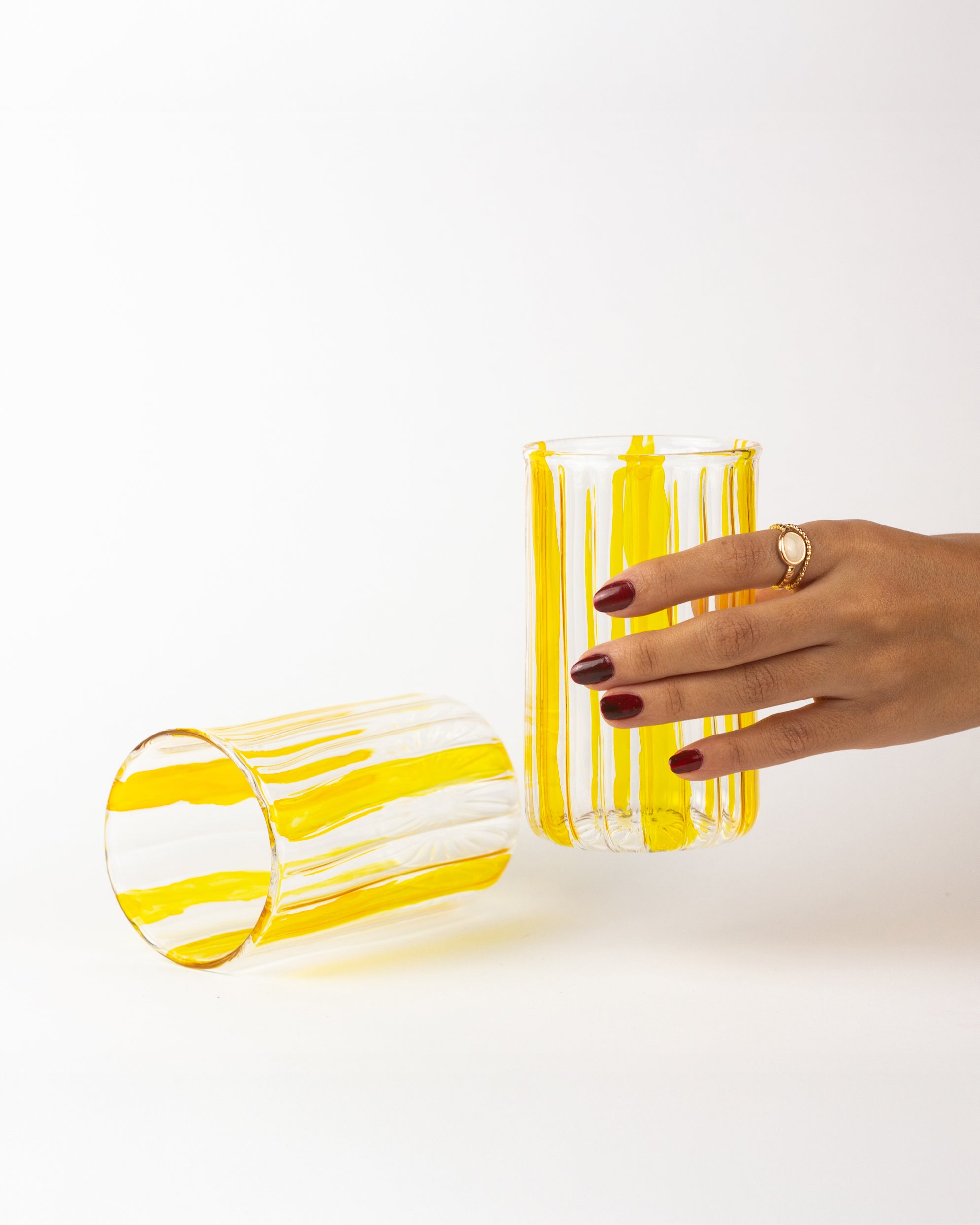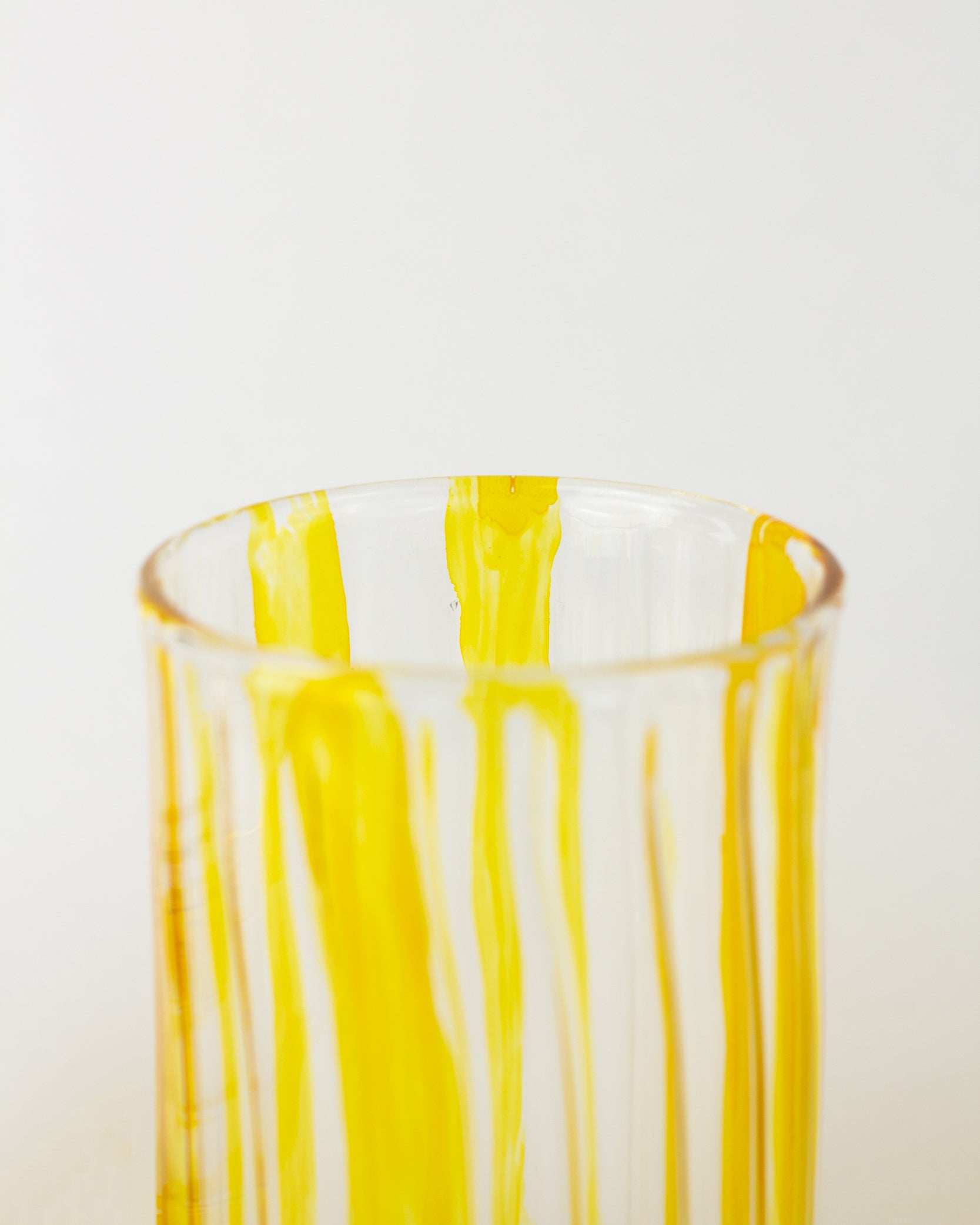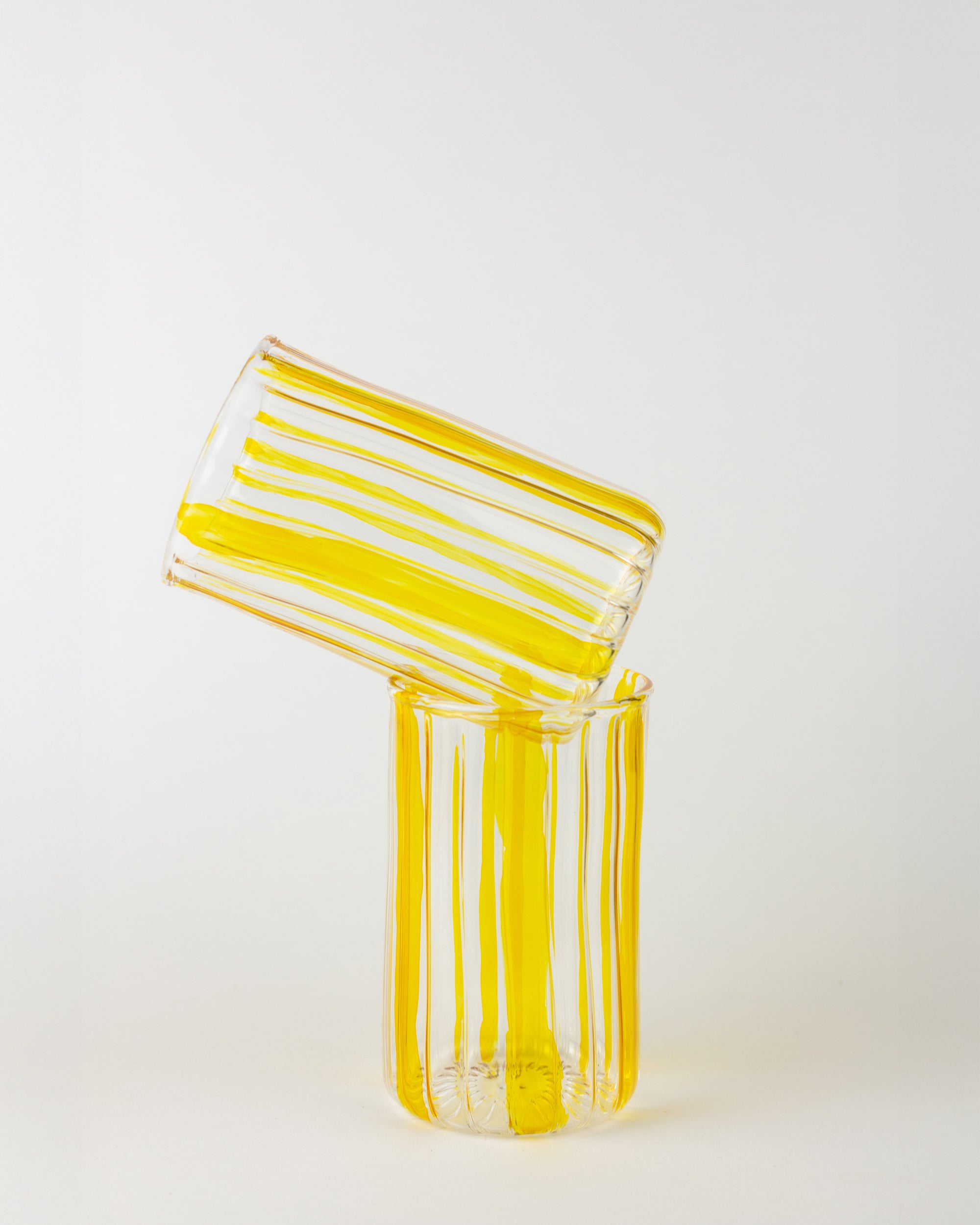 Handmade with care, this Pyrex glass cup features vibrant yellow stripes that add a cheerful touch to every sip. Its handcrafted design ensures each cup is unique, blending everyday practicality with artisanal charm.